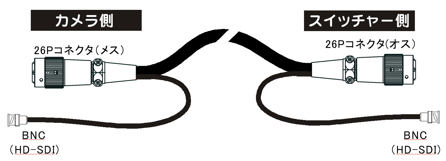 | 少々の工夫により、以下の信号が伝送できます。 ◆HD-SDI(50m) 26ピンコネクタを経由せず直結します。 ◆リターンビデオ(SD映像) ◆電源 DC12V等 ◆タリー ◆インカム |