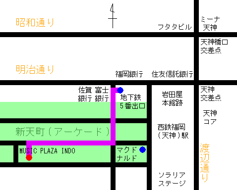 迷う人なんていないかもしれないけど、一応会場アクセスの説明しときまーす。 まず、福岡市営地下鉄で天神駅まで行きましょう。 100円バスとかで行く方法もあるけど、これが早くて確実です。 と言うか、それ以外のアクセス方法は面倒なのでパスします。 ★飛行機派:地下鉄福岡空港駅→天神駅(所要時間約11分:料金250円) ★JR派(JR博多駅より):地下鉄博多駅→天神駅(所要時間約6分:料金200円) ★夜行バス(新宿発西鉄高速バス)派:直通(但し先走って博多駅で降りないように) 改札を通ったら5番出口から階段を昇ります。 ※西口改札から出ると目の前の出口になります。 |